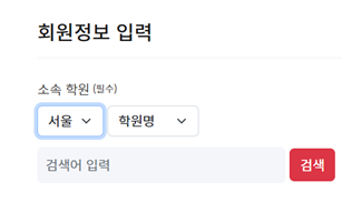 검색창에 본인이 재원하고 있는 지역과 학원명을 입력한 뒤 검색을 누르세요. 해당 학원이 검색되면 선택을 누르세요.
