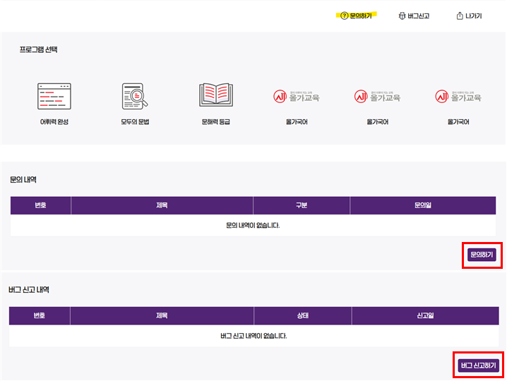 A. 온라인 학습 중에 궁금한 점이나 문제 오류 등이 발생하였을 때는 프로그램 내 문의하기와 버그신고 부분에 게시글을 남겨 주세요.