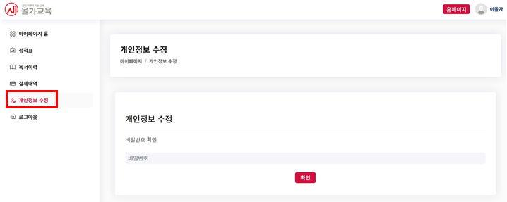 : 학원에서 임시 비번을 발급받은 후 마이페이지 > 개인정보 수정으로 들어가 비밀번호를 변경한 후 사용